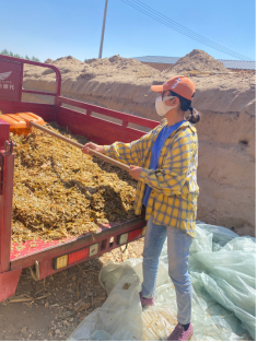 20级金融学积极分子乌永嘎,每天四点多就起来,先把青锄弄到下面图中的车上,然后带到另一个地方,让干湿草混合,然后再装到车里,再喂牛。喂的时候还要把牛按次绑好,有的还会冲撞别的牛,要格外注意。然后搞好牛棚卫生工作。要勤打扫粪便,打扫后铺上一层干土,让牛能很好地休息。