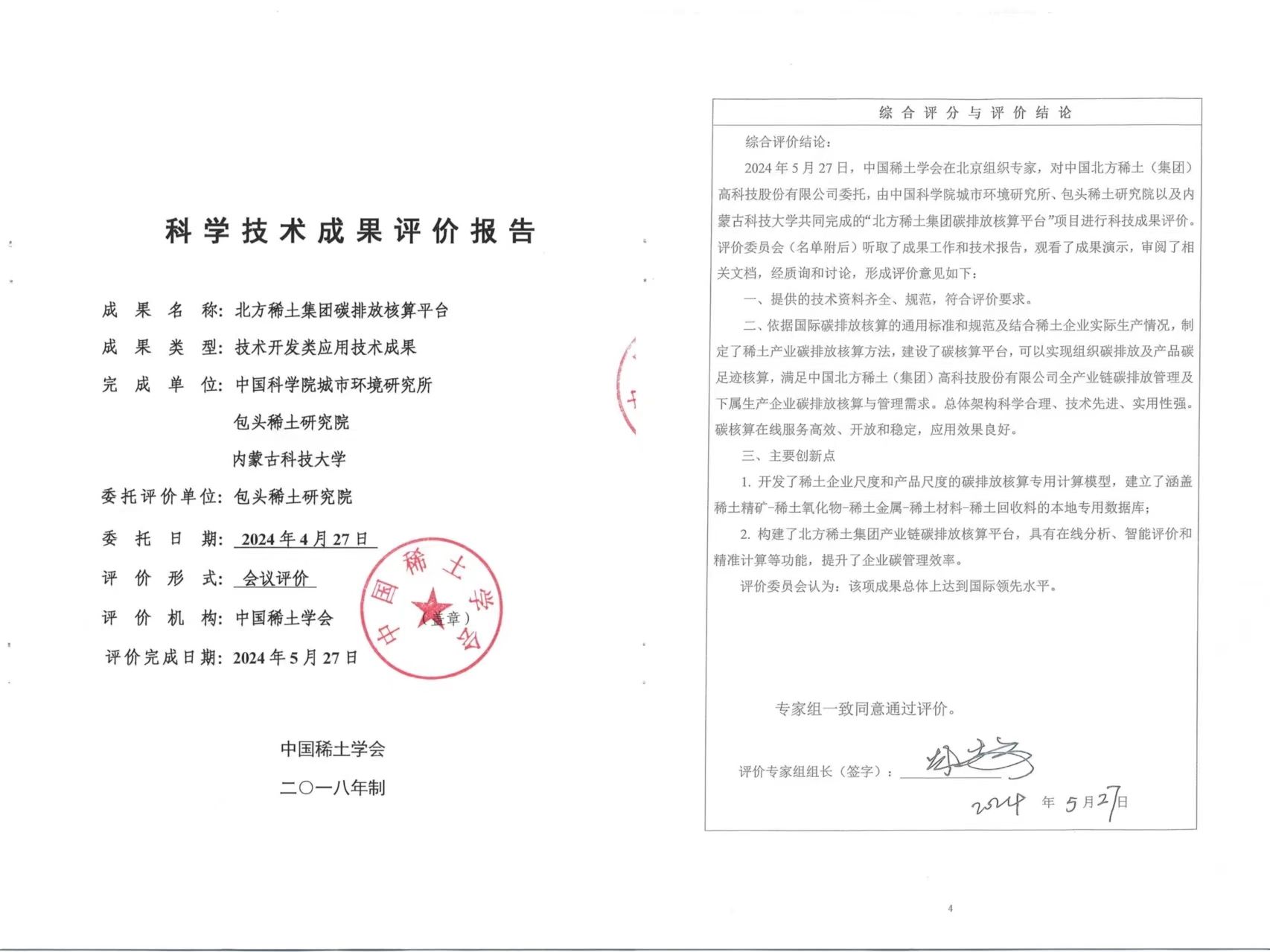 2024年5月27日中国稀土学会组织来自高校、研究院所和稀土企业的多位专家,对公司教师完成的“北方稀土集团碳核算排放平台”项目成果进行科技成果评价。
