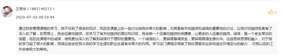 本课程在课程结束时,要求员工对课程中给涉及到的几个课程思政点的讨论进行感悟分享。通过员工在线上留言的反馈,大部分员工对校园贷的案例有很深的印象,通过资料查询和计算了解到校园贷的危害,起到了课程设计想要达到的知识、能力、素质目标。